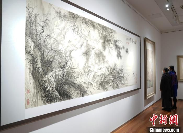 在展覽上,為慶祝中國藝術(shù)研究院建院70周年,田黎明和許俊,??苏\、周石峰、任清和曾三凱,劉萬鳴和劉彥水,趙建成、崔進(jìn)和劉少寧分別合作的《新綠》《千巖霞映》《棲禽圖》《我見青山多嫵媚》4幅丈二尺幅的中國畫同時亮相。