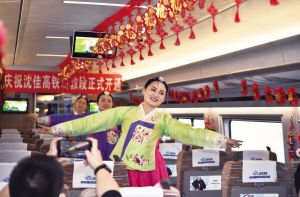 沈佳高鐵長(zhǎng)白山至敦化段開(kāi)通運(yùn)營(yíng),將促進(jìn)沿線旅游業(yè)和冰雪經(jīng)濟(jì)快速發(fā)展,進(jìn)一步加強(qiáng)民族團(tuán)結(jié),助力長(zhǎng)吉圖開(kāi)發(fā)開(kāi)放、深度融入 “一帶一路”。圖為列車工作人員在車內(nèi)表演朝鮮族歌舞。 新華社發(fā)