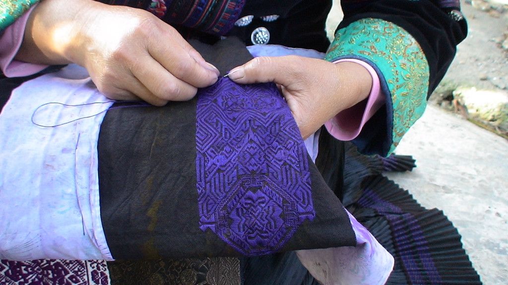 服裝的挑花刺繡均是依照布料的經(jīng)緯戳針,在繡法上多有變化,如平繡、數(shù)紗繡、織繡等,其紋樣層層疊套,圖案工整對(duì)稱,其繡技與織技完美統(tǒng)一,巧奪天工,具有很強(qiáng)的立體感。體現(xiàn)了苗族獨(dú)特的正挑反針挑花、刺繡、織繡等精湛工藝。