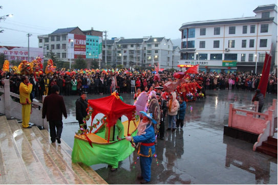 2019年2月16日農(nóng)歷正月十二是瓦寨鎮(zhèn)傳統(tǒng)大型集會活動日,舞龍為主要活動之一。午飯后,來自全縣各地的舞龍舞獅隊、花燈隊陸續(xù)到瓦寨政府廣場集結(jié),并在廣場右側(cè)有序排隊等待,各隊隊員精神抖擻、神采飛揚(yáng)、迫不及待。前來參觀元宵舞龍的群眾和游客也不斷涌向廣場,大街小巷行人猶如潮涌,吆喝聲、歡笑聲、鑼鼓聲連綿不斷……下午五時許,活動在瓦寨鎮(zhèn)政府廣場正式開始,先是由鎮(zhèn)領(lǐng)導(dǎo)對脫貧攻堅各項惠民政策及5年來瓦寨取得的攻堅戰(zhàn)績進(jìn)行宣講,宣講慳鏘有力、扣人心弦,特別是5年來瓦寨取得的攻堅戰(zhàn)績,一致得到人民群眾好評和認(rèn)可。隨后,舞龍、舞獅、花燈表演紛紛上演,只見黃龍時而上下翻騰,時而昂首擺尾,雄獅時而就地打滾,時而賣萌撒嬌,樣子憨態(tài)可掬,花燈表演幽默滑稽,在前行中跑出各種套路,起伏波動、生動活潑,吸引了所有人的目光,贏得了陣陣喝彩……