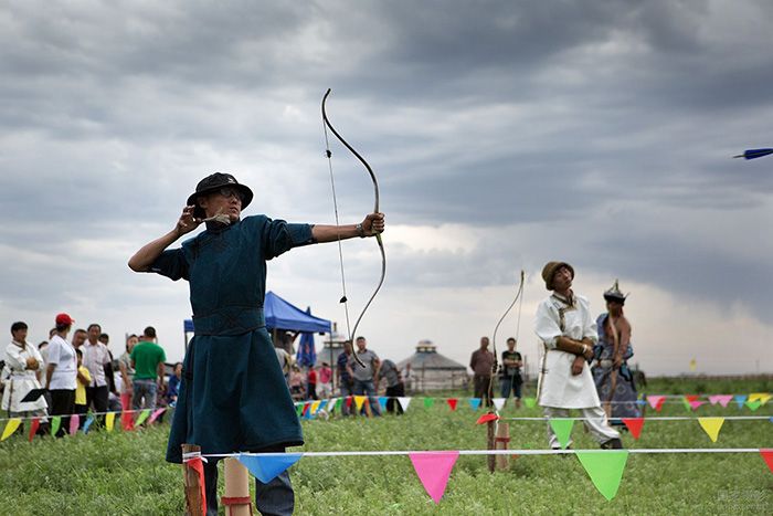 由于在歷史上弓箭是蒙古人生活中不可缺少的武器,人們也就非常尊重那些優(yōu)秀的射手,而射手也樂于當眾表演或比賽自己的技藝,因而射箭便成了那達慕的重要比賽項目。
