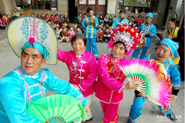 利川燈歌,又名燈調,始于清代初期,已有300多年的歷史,是人們逢年過節(jié)之時以彩龍船為道具,畫地為臺、亦唱亦演的民間藝術形式。2011年5月,利川燈歌被國務院公布為第三批國家級非物質文化遺產名錄。