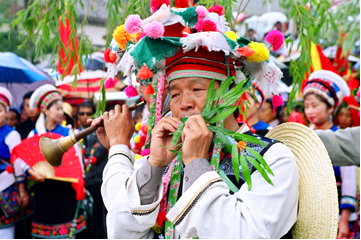 從整套太邑者么白族婦女服飾特征上看,是融合彝族服飾喜藍(lán)尚黑、色彩對(duì)比強(qiáng)烈的文化特點(diǎn),又從服飾的每一道圖案、紋飾來看,深受彝族遠(yuǎn)古圖騰崇拜的影響,原因是彝族人民世代居住在高山密林中生活,帶刺的枝條,有毒的樹枝,還有各種各樣的藤條荊刺;常常給他們的行走和生活帶來困難,所以這些藤條荊刺對(duì)他們來說簡(jiǎn)直成了不可抗御的神靈之物,于是產(chǎn)生“以物降物”的意思,模仿藤條荊刺的形狀在衣服易損的部位繡上藤條紋飾,其意思是說:你那么厲害的來傷害我,我也用同樣厲害的藤條荊刺對(duì)付你,這在精神上是一種力量,客觀上是所繡衣紋除了美觀之外,更主要的是為了加固衣服的牢實(shí)程度,更顯得服飾整體和諧及統(tǒng)一的美感,這就是融合了彝族服飾文化的內(nèi)涵而形成獨(dú)自風(fēng)格的山地者么白族服飾,同時(shí)也是山區(qū)白族服飾中較為典型的代表之一。
