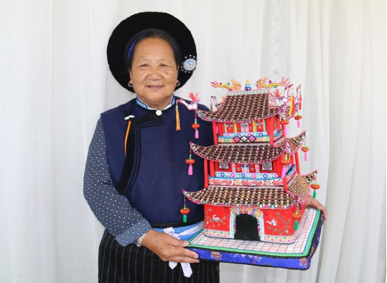 近年來,鶴慶縣高度重視民間文化遺產(chǎn)保護工作,甸南族刺繡作為民間特色文化遺產(chǎn)之一,得到較好的保護和傳承。近日,金墩鄉(xiāng)銀河村上曲江自然村71歲的老繡娘趙煥珍,經(jīng)過多次實地觀摩,邊做邊改,邊構思邊計算,以繡花、梳花、牽花、飄花、釘花等多種刺繡方法,歷時10個多月,把縣城的地標性建筑——云鶴樓按比例縮放,創(chuàng)作出了新的刺繡作品“云鶴樓”。