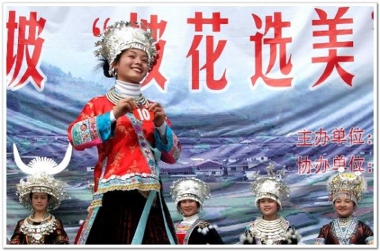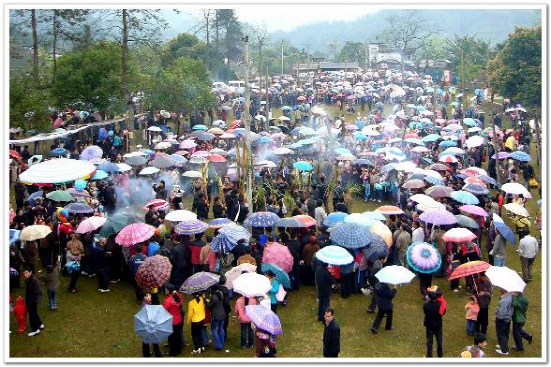廣西融水縣的香粉古龍坡會于每年農(nóng)歷正月十六舉行,所以又名“十六”坡。這一天、來自外國朋友、各地的游客及當?shù)胤綀A十里的苗哥苗妹,提蘆笙,提鳥籠、牽馬匹,打花傘……朝著十六坡趕來。正午時分,山梁上、村道間、河溪旁,出現(xiàn)了成列成隊穿紅戴綠的人群。遠遠望去,似一條彩帶在飄動。當萬余人江集后,整個坡地就成了彩色的世界。