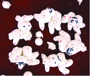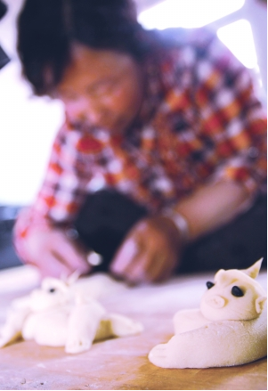 制面塑的工具比較簡單:有剪刀、菜刀、梳子、紅棗、花椒、紅豆等物。只要掌握好發(fā)面技術(shù),按照式樣進行捏制,那么一個鮮活的面模形象就會脫穎而出。面塑的藝術(shù)的特點是“一印、二捏、三鑲、四滾”另外還有“文的胸、武的肚、老人的背脊、美女的腰”。