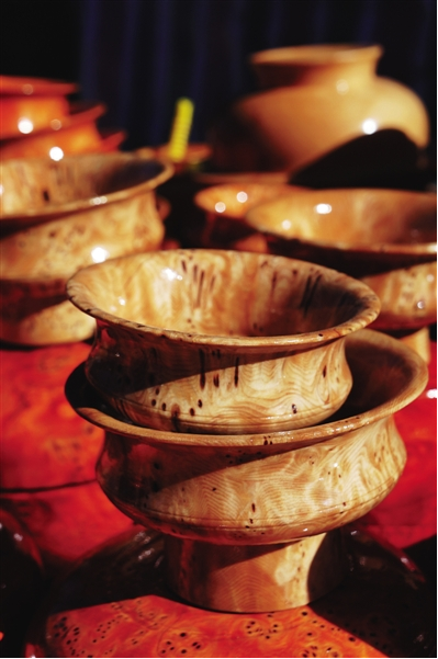 官員們使用的木碗,固然也非常注重外面的金銀寶石包裹,而木碗本身,也有一套非常固定的學(xué)問,盛開水不裂,摔到地上不會破,不燙手不冰手,體輕而質(zhì)固,經(jīng)久耐用,可以爺孫相傳。用這種碗盛食,可以完全保持食物原味,吃酥油糌粑等油肉類食品猶為適宜。比之于一般瓷碗,是碗中上品。這種木碗一般都是選用一些稀有雜木的節(jié)或者根雕琢而成,除了材料本身,在加工過程中的工序也十分重要,必須要加工出來一些獨(dú)特的花紋,比如磷火紋,或豬鬃紋,或貓頭鷹眼紋等,有這種花紋的碗,就要格外名貴,比如這次普布次仁兄弟所制作的大型核桃木碗,全身均勻地布滿了貓頭鷹眼紋,所以才能賣出這么高的價格。在西藏很多地區(qū),都流傳著這樣一個諺語:“一只上等木碗等于10頭牦牛。”