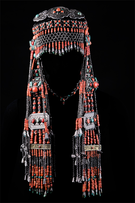 額頂飾:飾在頭箍之上, 形狀近似橢圓形,前部有四塊方形銀片,上掐絲嵌綠松石和珊瑚,其中最前部掐絲鑲紅珊瑚、綠松石拼成的蝴蝶型圖案, 銀掐絲工藝為托座。從整體來看銀絲捧紅花綠葉, 十分美麗。額頂飾兩端縫于青緞?lì)^箍上, 居于整個(gè)頭飾的中心位置。