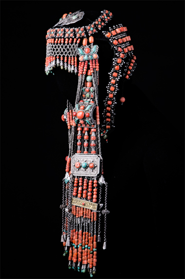 清代烏拉特蒙古族婦女頭飾, 具有著豐富的民俗思想和宗教思想。如頭飾中鑲嵌的珊瑚, 有的雕成日形, 有的雕成月形, 亦有山形、火形等等, 這與蒙古族自古以來的薩滿教崇拜有關(guān)。又如銀托座做成蓮花形、金鋼杵形或法輪形, 這又受喇嘛教的深刻影響。再如飾物做成魚形、蝙蝠形、壽字、喜字等等,則是中原漢族常用的吉祥圖案, 是漢文化滲入的反映。復(fù)如飾物上的珠子多為奇數(shù), 有三、九或是三、九的倍數(shù)等, 這是蒙古族長期形成的民族吉數(shù), 以九為大。整個(gè)頭飾就是一部民族思想觀念的綜匯大成。