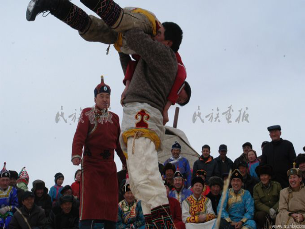 春節(jié),蒙古人稱為“白節(jié)”、“大年”,是蒙古人傳統(tǒng)節(jié)日,時間在農(nóng)歷正月初一。居住在農(nóng)村、城市、工礦區(qū)的蒙古族過春節(jié)的習(xí)俗同漢族差不多,但牧區(qū)有許多不同的特點。除夕之夜為“守歲”,合家老小席地坐在蒙古包中的矮桌周圍,桌上擺著一盤盤香噴噴的肉類、奶食品,以及糖果、香煙、美酒等物,有的還要在矮桌上供一張大紙,紙上寫著祖先的名字。午夜,開始飲酒吃年飯,或吃除夕餃子。按規(guī)矩團圓之宴要多吃多喝酒、肉,食器要擺滿滿一席。如吃不完也要剩得越多越好,象征新的一年里吃喝不盡、年年有余。家里的年輕人,要向長者敬“辭歲酒”。特別有意思的是全家共吃一塊由酥油、糖、白面烙成的大圓餅,這叫吃新年餅,每人只吃一口,意思是全家永不分離,永久團圓,永遠(yuǎn)過甜甜蜜蜜的日子。除夕之夜要?!案吕尽保ㄍ嫜蚬穷^)、說書、唱歌、跳舞,通宵達(dá)旦,熱鬧一宿。過大年,按習(xí)慣還要拜年,大年三十晚上為辭舊歲禮, 初一早上為迎新年,晚輩給父母和老人叩頭、敬酒、獻(xiàn)哈達(dá),祝老人們身體健康,晚年幸福!老人擁抱孩子們,并斟上一碗鮮奶,祝愿子女們幸福,像牛奶一樣純潔。大年初一早餐后,男女盛裝,三五成群來到浩特(村鎮(zhèn)),挨家串戶給親友拜年。客人進(jìn)屋首先向長輩叩頭拜年,祝愿老人身體健康,年豐人壽。按習(xí)慣由主人家的女婿向客人逐個敬酒,每敬必喝,或邊喝邊唱,邊唱邊舞。