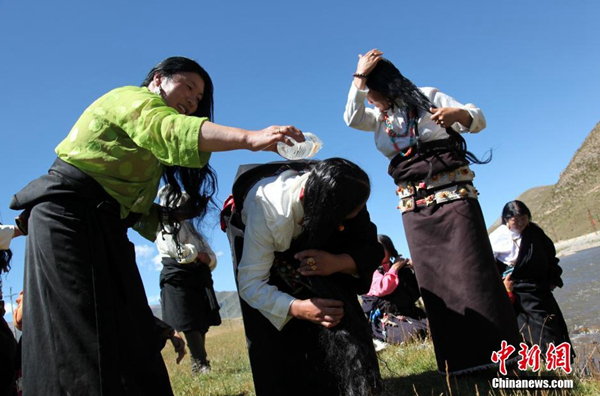 37歲的藏族青年旦增跟記者開玩笑,“自己看上去比實際年齡年輕,就是因為年年都來沐浴?!彼X得藏族民眾初秋過“沐浴節(jié)”,能夠提高抵抗力,與內(nèi)地所講的“春捂秋凍”本質(zhì)相同。旦增介紹說,不能在流水中過“沐浴節(jié)”的藏族民眾,會在月光照過的盆中凈水洗頭。