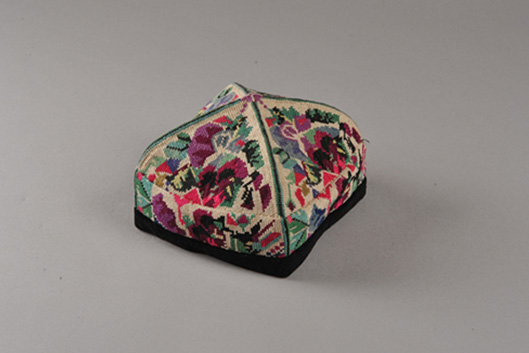 “曼甫朵帕”此款花帽是由手工刺繡成的,四瓣以帽頂為中心拼接縫合,套模成型,以黑絨鑲邊,四棱可折疊。每一瓣三角形內(nèi)以一個(gè)或兩個(gè)單獨(dú)紋樣,一條邊緣紋樣構(gòu)成一組適合紋樣,這種紋樣簡練、構(gòu)圖嚴(yán)謹(jǐn)?shù)幕眻D案稱為單獨(dú)適合紋樣花帽,維吾爾語稱“曼甫朵帕”。此花帽紋樣大都是以新疆花卉、果實(shí)等自然形態(tài)為素材,加以藝術(shù)的提煉、概括、夸張、變化而使之成為具有濃郁鄉(xiāng)土氣息和強(qiáng)烈民族情趣,圖案有花卉、果實(shí),造型有石榴花、桃花、杏花、麥穗,還有星月、雪花等。此外還大量運(yùn)用了富有變化的幾何圖案。布底為一色平線,圖案則用優(yōu)質(zhì)彩色絲線混合棉線刺繡而成,形成底色和花色對比強(qiáng)烈,艷麗奪目。