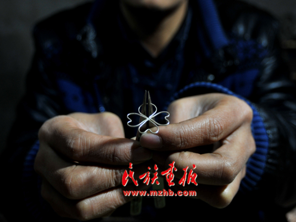 苗族銀飾鍛造技藝工藝流程大致包括鑄煉、錘打、拉絲、搓絲、掐絲、焊接、編結、鑲嵌加固、洗滌等。龍?zhí)栐阽Y刻圖案時并沒有任何范本,工藝的精細靠的就是他心中有圖,手中有數。