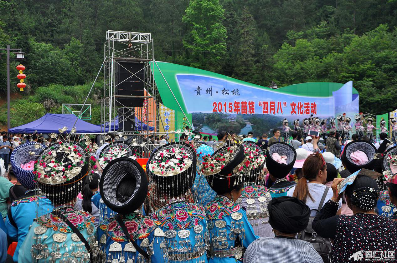 “四月八”的由來傳說甚多,主要是為憑吊“四月八”葬于今噴水池一帶的古代苗族英雄,輩輩相傳,而成習(xí)俗。傳說古代有一個名叫“亞努”的苗族首領(lǐng),領(lǐng)導(dǎo)苗民向統(tǒng)治者進行斗爭。他曾組織各寨苗族頭人在“喝血坳”地主喝雞血,發(fā)誓共同聯(lián)合,戰(zhàn)斗到底。并約定四月八日在某山聚眾起義。起義后,義軍連連獲勝,一直打到了四川、貴州。第二年的四月八日,亞努不幸戰(zhàn)死在貴陽市的噴水池附近。苗族人民為了紀(jì)念這位民族英雄,便于每年的四月八這一天,舉行紀(jì)念活動,追思亞宜的業(yè)績,為戰(zhàn)死者掃墓。清代乾嘉苗民起義后,統(tǒng)治者禁止湘西苗族人民舉行這一活動,新中國成立后經(jīng)國家民委批準(zhǔn),將“四月八”定為苗族統(tǒng)一的節(jié)日(圖為2015年貴州松桃苗族“四月八”節(jié)慶盛況,引自貴州銅仁政府網(wǎng)“同仁社區(qū)”)。