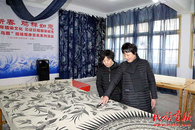 寧曼麗(右)和吳安麗在討論長(zhǎng) 10 米、寬 1.6 米的蠟畫(huà)《百鳥(niǎo)圖》