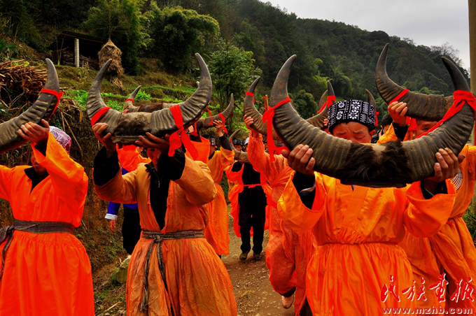 “黃袍錦衣”的寨老手捧牛角帶領(lǐng)族人前去“跳洞”,他們一邊走、一邊舉行祭儀