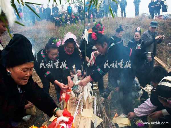 招完白虎龍后,天已大亮,這時村里人抬著一頭豬上來了,村民把龍橋龍凳做好,安放在壩子中央。接下來,儀式進(jìn)入招龍程序。在龍橋龍凳的前方,擺上煮熟的豬頭、豬尾、豬腳和心肝、12坨豬肉、12碗甜酒、12碗糯米飯等祭品。12位招龍代表整整齊齊地站在龍橋龍凳的后方,燒完香紙后,由師傅開念招龍詞,把四面八方的大河小溪、大坡小坡、大嶺小嶺、大梁小梁、大橋小路、寨邊古樹的龍魂全喊到招龍場地來。傳說龍是治水的,苗族人崇拜龍,把龍招進(jìn)來是為了保佑全村男女老少百年長壽,家家戶戶發(fā)子發(fā)孫,解災(zāi)脫難,風(fēng)調(diào)雨順,五谷豐登,喂牛牛大,養(yǎng)豬豬肥,養(yǎng)雞雞發(fā),順順利利,平平安安。師傅念完后,與招龍代表把12杯酒喝完,表示程序完畢。不久,全村男女老少三三兩兩都來到了山上,許多婦女帶著祭品燒香燒紙求子求孫,龍橋龍凳四周擠滿了人,香火彌漫整個山坡。