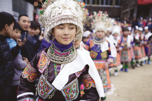圖為當(dāng)?shù)孛缱骞媚锸⒀b參加“跳月”活動(dòng)。