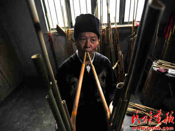 莫師傅在對兩個蘆笙進(jìn)行高低音的和諧調(diào)試