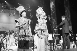 廣西戲劇院成立一年來(lái),承擔(dān)起壯劇、桂劇、彩調(diào)劇3個(gè)國(guó)家級(jí)非物質(zhì)文化遺產(chǎn)劇目和京劇國(guó)粹藝術(shù)的傳承、保護(hù)、發(fā)展重任,不斷推出具有“美麗廣西、壯鄉(xiāng)風(fēng)格、時(shí)代特征、和諧兼容”的舞臺(tái)藝術(shù)精品,此次推出的《壯族詩(shī)情》便是其中之一?!秹炎逶?shī)情》共分“地鼓”、“天歌”、“水秀”、“山雄”4個(gè)章節(jié),以150多名演職員的演出陣容,通過(guò)合唱、獨(dú)唱以及民族器樂(lè)演奏的形式,如詩(shī)如畫(huà)地描述了廣西壯族的風(fēng)土人情,突出了“美麗廣西”時(shí)代主旋律。圖為《壯族詩(shī)情》演出現(xiàn)場(chǎng)。