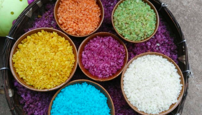 花糯米飯是先用各種植物的根、莖、葉、花經(jīng)石臼沖搗細(xì)碎后,用水浸泡或煮沸一定時(shí)間,成為不同顏色的汁液。再用這些汁液分別浸泡淘洗干凈的糯米,使其著色,蒸熟后即成不同顏色的糯米飯。其色彩有黑、紅、黃、綠、紫、白(大米本色)等六七種。一般取五色為多。