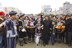 望謨布依寨老和小朋友迎接各位領導、朋友、嘉賓進入活動會場