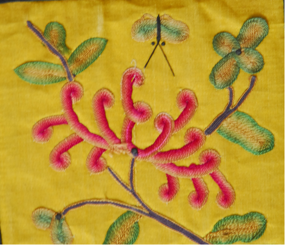 1.平針繡,又稱“直針”,是滿族枕頂刺繡最基本的針法之一,它能準(zhǔn)確地表達(dá)植物花卉、動物禽獸、人物、器物等。在所有針法中,平針是分布最廣、使用范圍最大的針法。它的運針方式是起針、落針都在圖案的輪廓邊緣,針腳排列均勻,線跡平行,不重疊交錯,紋樣之間的線條靠空出地面來表現(xiàn)。