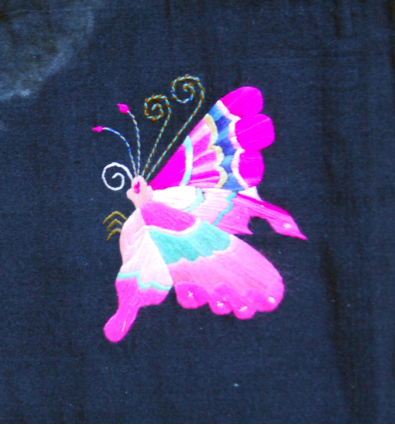 5.拽蜂,是在面料平底上繡制出立體的蝴蝶。由于繡工精細(xì),找不出怎樣連接繡制的地方,好像從布地子上拽出來的蜂,“拽蜂”之得名,古代稱蝴蝶為蜂。