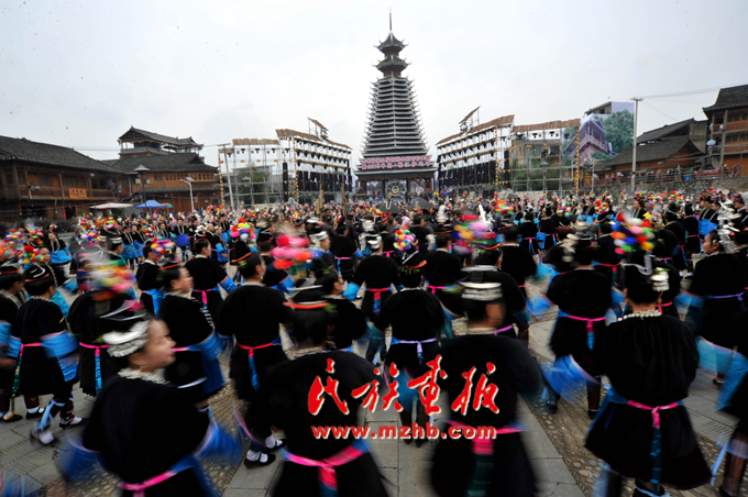 此外,侗族還有些極具民族特色的民族節(jié)日或活動。例如斗牛節(jié),一般在每年農(nóng)歷二月與八月的亥日舉行。侗族每個村寨幾乎都有為比賽而飼養(yǎng)的“水牛王”,“牛王”的圈稱為“生宮”?!芭M酢币话阌袑H孙曫B(yǎng),其吃的食物除了飼料,還有蜂蜜、豬油等,可見侗族人民對此的重視程度。還有“為也”,這是個音譯的名稱,是做客的意思,它特指村寨之間互相訪問的集體客人,這是侗鄉(xiāng)規(guī)模最大的社交和娛樂性活動,一般在春季或秋后舉行。貴州黎平、榕江、從江一帶的“為也”隊伍多以歌隊或戲班為主?;顒訁⑴c人數(shù)從10人到100人不等,男女老少皆可參加,場面十分熱鬧。與之類似的還有南侗地區(qū)的“為嘿”“為頂”“行歌坐月”等活動?!盀轫敗薄靶懈枳隆笔谴逭信嗄曛g互訪、社交的活動。還有每年農(nóng)歷六月的第一個辰日“林王節(jié)”,是紀(jì)念侗族農(nóng)民起義軍領(lǐng)袖林寬的節(jié)日(圖為薩瑪節(jié)上盛裝的侗族姑娘。寧堅攝,引自民族畫報)。