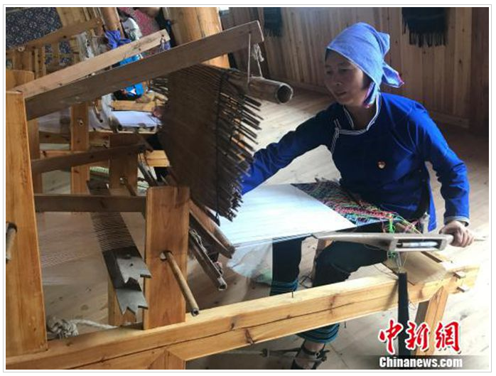聽聞姐姐在這里織錦每月可拿到3000多元的收入,今年7月,此前在廣東務(wù)工的文坡村二組村民龍練霞干起了這份家門口的工作,再也不想外出了?!凹确奖阏疹櫦胰?,又可以抽空干點(diǎn)農(nóng)事?!苯衲?0多歲的龍練霞說(shuō)。和她一樣,看到侗錦的銷路慢慢打開了,村里許多在外務(wù)工的年輕人也紛紛返鄉(xiāng),拾起祖輩們的老手藝。