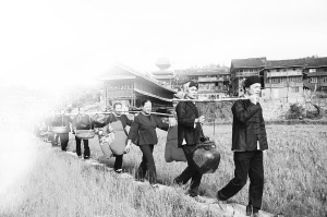 貴州省榕江縣仁里水族鄉(xiāng)仁吉侗寨發(fā)現(xiàn)的蘆笙曲譜,是用類似象形文字的符號(hào)記錄的,共有13個(gè)符號(hào)。每一個(gè)符...