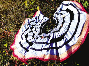 白褲瑤服飾的面料都是老阿婆手搖紡車,把一捆捆棉麻用勤勞智慧的巧手紡織成細(xì)紗,合著穗捻成勻稱的線。阿妹們?cè)賹⒕€繞到線筒上,然后輕涮漂洗,繞到高腳糧倉(cāng)下。線晾干后進(jìn)行紡織,一塊塊自紡的棉紗土布就形成了,之后就可以在這塊布上盡情“作畫”了。