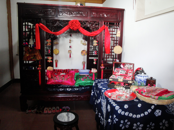 白族婚禮一般要舉行四天,第一天叫“預(yù)喜”,主要是殺豬宰羊,搭彩棚,迎喜神,接月老以及布置客堂、洞房和貼對聯(lián)等。第二天為“正喜”,嗩吶高奏,鑼鼓喧天,或騎馬或坐轎,迎親隊(duì)伍浩浩蕩蕩到女方家迎新娘,在完成了一系列妙趣橫生的禮儀后,經(jīng)媒人再三催請后,新娘才依依不舍,由其親兄長背出門。新娘迎出門外后,新姑爺還要專門返回給丈母娘磕頭拜別,意為“回馬謝親”。新娘進(jìn)門時要跨火盆或馬鞍,表示興旺或平安,有人還要故意在火盆里灑上辣椒面,嗆得大家流淚,白語里“辣”叫“qil”,與“親”諧音,表示以后親親密密。新娘迎進(jìn)門后,拜堂前要梳妝,即女子換頭禮,請年高婦女為新婦梳頭,先戴鳳冠,然后換成紗帕,腳踩裝滿糧食的斗,寓意五谷豐登,魁星踢斗。斗中擺一桿秤,寓意新娘心像秤一樣公平,對丈夫?qū)Ω改敢灰曂?,又放置一把剪刀,表示新娘對愛情的忠貞不二。第三天回門。新娘清晨早起,在別人幫助下“收頭”,將頭發(fā)梳成高高的髻,作為成人的標(biāo)志,然后由新郎陪同回娘家。新娘手中提著一籃糖果,有花生、瓜子、水果糖之類,路上遇到熟人和小孩,就抓給一把。這天新娘家要辦酒席招待女婿,女婿一一拜見岳家長輩,新婚夫婦當(dāng)日返回男家。第四天酬客,折彩棚,招待幫忙的客人。