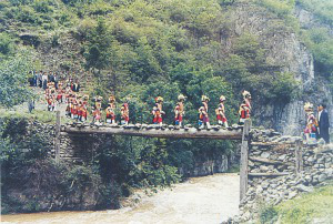 頌藥仙活動各村為陣,是一項以傳授藥物知識和防病方法為主題的歌舞活動。早早吃過晚飯后,人們集中到白天洗揀藥物的水邊,用青松和花草編扎的轎子抬上藥仙的肖像,敲鑼打鼓、載歌載舞,把藥仙抬到她的化身“定居”的山林中,舉行頌贊藥仙功績的儀式?;顒訄龅厮闹?,插遍各種花枝,花枝上掛滿姑娘們精繡的荷包,荷包中裝的是各種治病的藥粉。場中央燃燒著熊熊篝火,火邊供著藥仙的肖像。參加活動的人,各持兩束用藥用植物編成的“花束”,在歌頭的帶領下,眾人手舞“花束”,環(huán)篝火踏歌而舞。用動聽的歌聲,歌唱藥仙嘗百草、治疾病的故事;介紹用中草藥防病、治病的知識……踏歌接近尾聲時,人們便把手中舞耍的“花束”丟進篝火中焚燒,象征把各自身上的病疾丟盡,實際上是借焚藥草來達到消毒防病的目的。