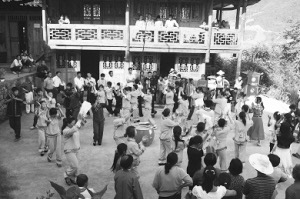 從古至今,每年的正月初九“舍巴節(jié)”(舍巴:土家語(yǔ)擺手舞的意思)、三月三“祭祖節(jié)”、“冬至?xí)保良胰硕家跀[手堂舉行盛大的祭祀活動(dòng)。農(nóng)閑時(shí)的夜晚,在農(nóng)家院壩,點(diǎn)燃熊熊篝火,男女老少在有奏的鑼鼓聲中歡快地舞蹈,盡情地歌唱。清代文人彭施鐸在《竹枝詞》中載:“福石城中錦作窩,土王宮前水生波,紅燈萬(wàn)盞人千疊,一片纏綿擺手歌?!绷攘葦?shù)語(yǔ)把土家人跳擺手舞的盛況真實(shí)地展現(xiàn)出來(lái)。