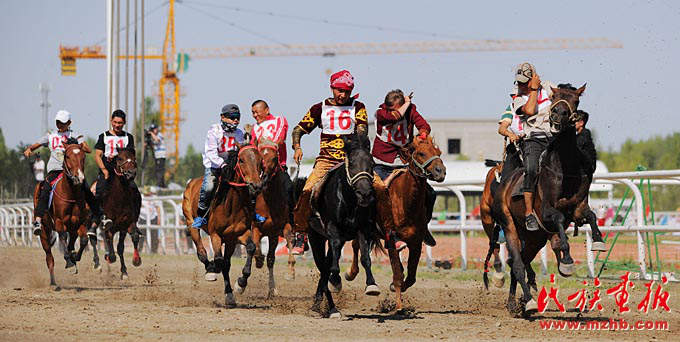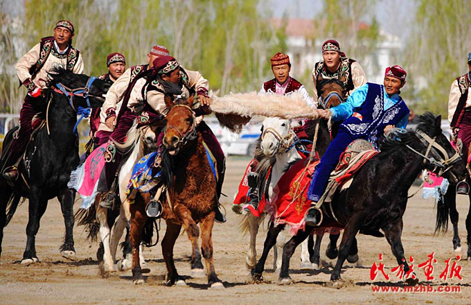 “叼羊”是哈薩克族一種力量和勇氣較量的馬背上的比賽。圖為阿克塞縣賽馬會(huì)上的叼羊比賽