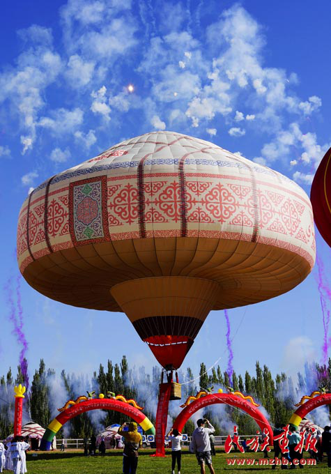 氈房是哈薩克族的傳統(tǒng)民居之一,是哈薩克族人游牧?xí)r居住的地方。圖中直徑長(zhǎng)達(dá)21米、高23米、體積達(dá)2800立方米、通過(guò)世界紀(jì)錄協(xié)會(huì)認(rèn)證的這只阿克塞縣的旅游空中形象大使,是目前世上最大的哈薩克族氈房熱氣球