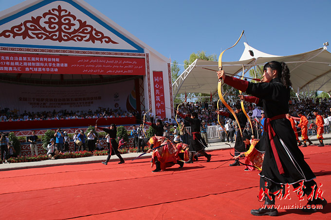 射箭是游牧民族在過(guò)去的游牧生活中必會(huì)的生存本領(lǐng)之一,哈薩克族的射箭也是傳統(tǒng)的體育競(jìng)技項(xiàng)目。圖為阿克塞之鷹2017年絲綢之路騎射國(guó)際大學(xué)生邀請(qǐng)賽上,學(xué)生的射箭展示