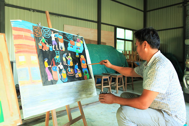 喊沙寨的農民畫家吞也正在作畫,畫中描繪的是傣族群眾的釀酒過程