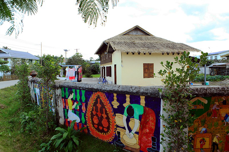 喊沙寨里的彩色畫墻和傣家竹樓
