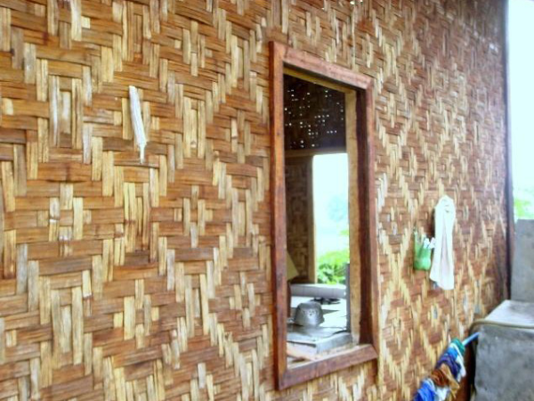 上層近梯處有一露臺,轉(zhuǎn)進為長形大房,用竹籬隔出主人臥室并兼重要錢物存儲處。其余為一大敞間,屋頂不甚高,兩邊傾斜,屋檐及于樓板,一般無窗。若屋檐稍高則兩側開有小窗,后面開一門。樓中央是一個火塘,日夜燃燒不熄。屋頂用茅草鋪蓋,梁柱門窗樓板全部用竹制成。