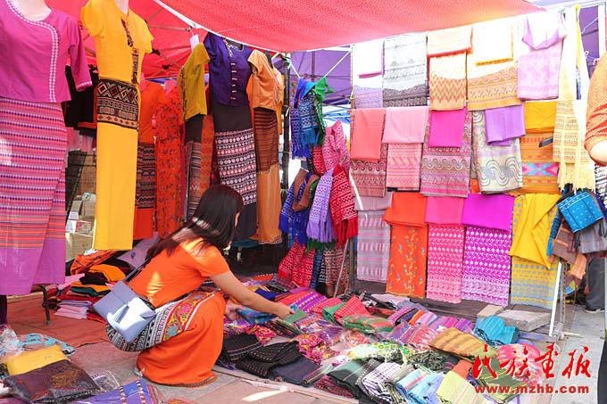 慶典活動(dòng)上人潮涌動(dòng),氛圍隆重。位于文化廣場(chǎng)的演出中心區(qū),傣族情歌對(duì)唱、孔雀舞表演、傣拳武術(shù)表演、傣劇等節(jié)目輪番上臺(tái)。在舞臺(tái)四周,一座座簡易搭建的攤位前,賣有傣族服飾、貨品、傣文書籍等。街道兩旁的小吃一條街,擺有竹筒粑粑、撒撇、楂子、地瓜等特色美食。