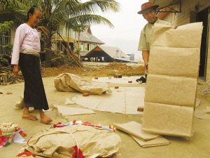 巖妞說,制作孔明燈最主要的材料是傣族的棉紙和竹編。棉紙來源于木棉樹。傣家人摘取木棉樹的樹葉并用牛油來煎熬,使之變?yōu)榘蛋咨臐{汁,待熬熟之后便拿到河邊沖洗,把其中的灰塵和沙粒洗凈。隨后,將洗凈的木棉樹漿汁攤均勻后在陽(yáng)光下曝曬,曬干后便能拿來制作孔明燈了。一般的紙很容易被燒壞,而這種手工制作的棉紙韌性好,不容易撕裂和燒壞。