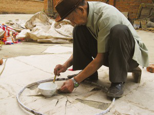言談間,巖妞把制好的竹環(huán)放入早已畫好的同心圓圖案中的小圓上,只見竹環(huán)大小正好與小圓吻合。巖妞說,圖案外側(cè)的大圓便是擺放棉紙用的。接著,他把手中厚厚的幾張棉紙圍繞著已經(jīng)放入圖案中的竹環(huán)依次擺入,直至擺滿。在同心圓圖案的上側(cè),巖妞還畫了一個(gè)寬與同心圓圖案的直徑相符的矩形圖案,把棉紙鋪滿其中。巖妞說,這圖形就是“貢菲”的高度。制作的最后一道程序,是把棉紙用漿糊粘合起來。陰干后,一個(gè)“貢菲”就做好了。
