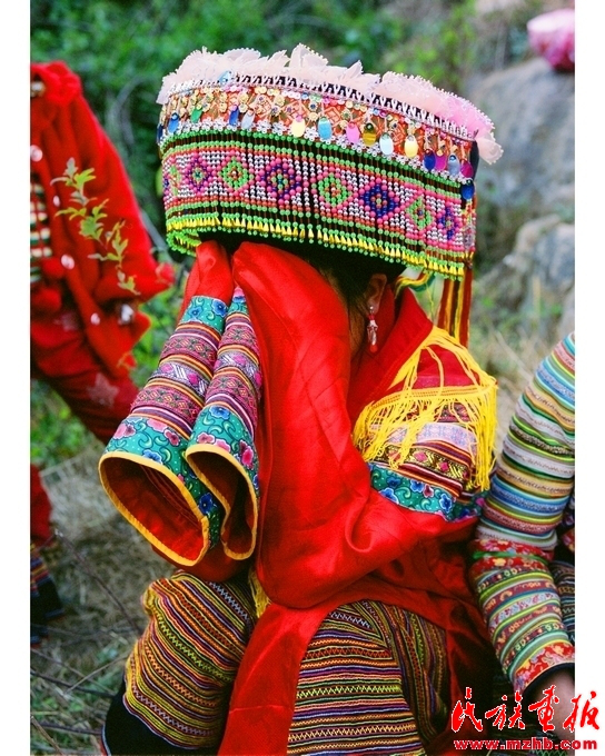 刮臉回來后,張正秀就由姐妹陪伴在閨房。屋外送親的酒席在熱鬧中開席時,舅母就回到閨房里為她洗臉洗腳,改換嫁衣。按傳統(tǒng)習俗,要把新娘用過的水潑灑在閨房的地上,以示吉利。新娘穿上由親人縫制的繡花衣裙,從頭到腳煥然一新。穿戴整齊后,新娘由伴娘陪同坐在閨房門旁的草地上接受祝福。女方家請的懂禮儀的阿巴莫(司儀)手持菜花和松針葉在堂屋敬女方家神,告訴家神姑娘要出嫁了,并給前一天夜里來新娘家領親的兩位娃拿扒(證婚人)挎上兩條交叉打結的紅布,表示娃拿扒已承諾為女方家領親。