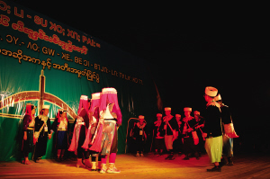 2011年,緬甸傈僳學(xué)會在密支那舉辦了第一屆世界傈僳闊時節(jié),第一次將十幾米高的弩弓木雕作為會徽。該木雕高高聳立于密支那郊區(qū)闊時節(jié)會場,還有印有傈僳族徽的紅旗插滿會場四周,高高飄揚,與巨型木雕相互輝映,構(gòu)成了一個以弩弓木雕為核心,族徽紅旗環(huán)繞的闊時節(jié)會場空間。其內(nèi)其外,傈僳族空間與非傈僳族空間區(qū)隔明顯。
