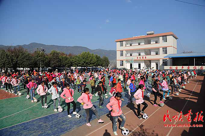 早晨,學(xué)生們歡快地沖出教室,每人手捧足球,在老師統(tǒng)一的號(hào)令下跳起了足球課間操