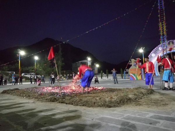 上刀山、下火海,是傈僳族民間的傳統民俗活動,是其傳統節(jié)日“刀桿節(jié)”上的主要表演項目。傈僳族的“刀桿節(jié)”源于一種原始的宗教活動。早期在“刀桿節(jié)”上表演上刀山、下火海的勇士們,都得聽命于巫師。上刀山、下火海之前,有一套繁瑣的宗教祭祀儀式。而且每個上刀山、下火海的勇士身上都要掛上幾十條巫師畫的符咒,使這一活動蒙上了濃厚的宗教色彩。經過改革的傈僳族的“刀桿節(jié)”,一般于每年二月初八舉行,屆時,上刀山、下火海就是表演的重要內容。上刀山之前,人們首先豎起兩根20 多米長的筆直的松樹桿。在樹桿之間順序捆上36 或72 把鋒利的刀刃向上的鋼刀作梯子。表演開始后,表演者赤手光腳,蹬上梯子頂端,并要做些“蜻蜓倒立”“飛燕迎春”等高難動作。下了刀桿后,勇士們還要赤裸著上身、光著腳跳入熊熊烈火中,甚至用身體滾壓火海,直至炭火逐漸熄滅為止。此后,群眾性的娛樂活動就開始了,唱歌跳舞,呈現出節(jié)日的歡樂氣氛。上刀山、下火海,是經過表演者長期的武術和氣功訓練才能完成的。這一活動也表現出傈僳族人民機智、勇敢、知難而進的優(yōu)良品質。