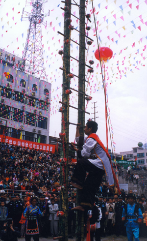 節(jié)日里,婦女們穿著鑲花邊的黑色上衣和點綴著各種銀飾物的花裙,佩戴耳環(huán)、項鏈等首飾,風(fēng)采奪人。男人穿著麻布短衣褲,腰系紅黃長帶,小腿系吊簡,腰佩長刀,肩挎箭包,英姿勃勃。節(jié)目的廣場上,堅趄兩根二十米高的樹干,四周用藤蔓拉緊固定,樹桿上插有三十六把明晃晃的長刀,作為向上攀登的橫檔,刀刃向上,寒光逼人,謂之“刀竿午間。鞭炮齊鳴,鑼鼓震天”。身穿大紅抱、頭纏紅布包頭、赤腳的五名“玩火者”,齊涌至竿下,圍繞刀竿唱歌跳舞,將斟滿的白酒一飲而盡,縱身飛上刀竿。雙手緊提刀面,運足氣的腳掌斜置在鋒利的刀刃上,勇敢、靈巧地向上攀登。全場鴉雀無聲,大家屏住呼吸仰面觀看,對他們的氣功絕技贊嘆不已。噼噼啪啪的鞭炮聲來自竿頂優(yōu)勝者,響徹云霄。全場歡呼跳躍,爭相向爬桿者敬獻美酒。對歌、跳舞、蕩秋千活動為節(jié)日增添了濃郁的氣氛。丟煙包(煙盒)活動別具一格,青年男女各站一方,互擲煙包,姑娘將小伙的煙包收藏起來,說明姑娘接受了小伙子的愛慕。
