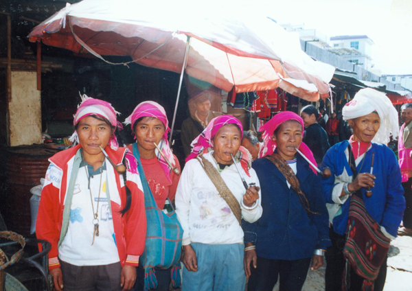而婦女們的裝束特點(diǎn)分明與眾不同。最突出的是頭戴寬約3公分左右的銀箍,留長發(fā);身著靛青色無領(lǐng)大襟右衽及橫條花筒裙。腰系紅布寬腰帶和數(shù)十根細(xì)藤圈。耳掛垂肩圓形大耳環(huán),頸戴銀質(zhì)大項(xiàng)圈,細(xì)項(xiàng)鏈。上了年紀(jì)的人,喜歡戴長約五公分傘狀大耳筒,筒頂還刻有各種花紋。有的婦女在耳筒內(nèi)插上香花香草,有的放上人民幣,出門趕集,隨用隨取,很是便利(上下兩圖由劉軍供圖)。
